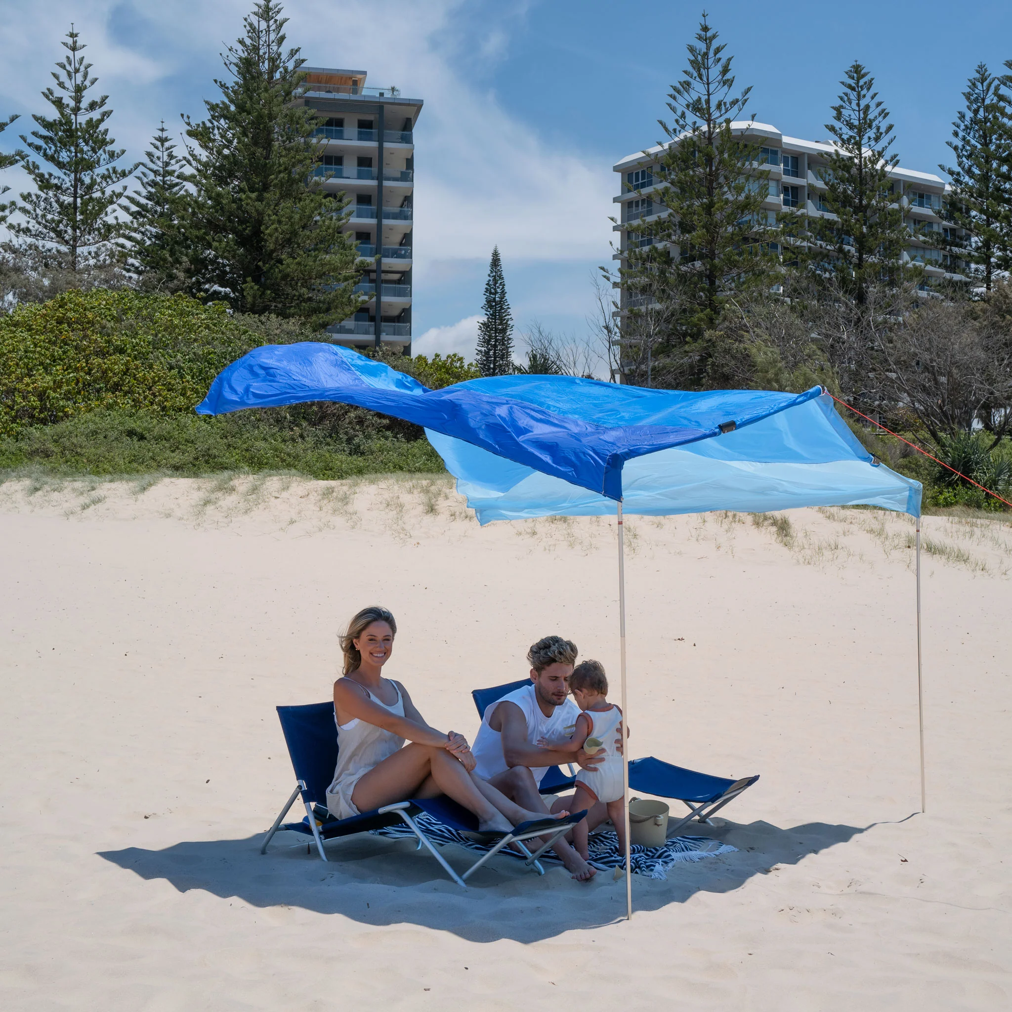 The Vento is powered by the wind. Specifically designed for use on extra windy beach days, the Vento stays open with the help of the wind. This design has created our most lightweight and compact beach shelter ever.